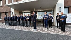 盛大な拍手の中、玄関前に監督・スタッフ・選手が整列し、学園理事長、生徒会長から優勝を祝う挨拶があり、花束が贈呈された後、加藤校長、青栁監督、箱山主将によるお礼の挨拶と続きました。