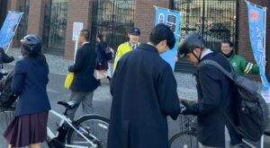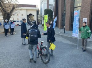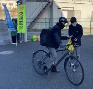 この取組は、高崎市地域交通課の依頼を受けて実施したもので、高崎警察署や高崎市役所、群馬県ヘルメット着用啓発チーム(GMET)、安全協会高崎支部の各職員、群馬県交通安全啓発キャラバン隊の方々が来校され、生徒会役員とともに、本校の自転車利用者に対して啓発用グッズを配布し、ヘルメット着用や交通事故防止の声掛けを行いました。また、本校前の道路では、交通指導を行う本校教員の隣で、キャラバン隊の方々がドライバーに対して交通法規の順守や安全運転を促すボードを掲げていらっしゃいました。