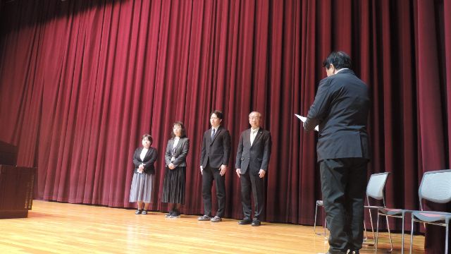 終業式に続いて、退任式が行われ、今年度をもって退任される先生方のうち4名が登壇され、お一人お一人からご挨拶をいただきました。