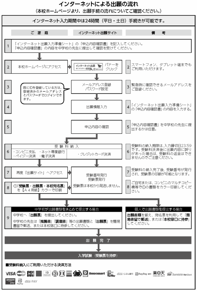 下記の期間に、本校受付窓口にコンピュータ・プリンタを用意しますので、前日の15:00までに電話予約の上、ご来校いただき、手続きを行ってください。(ご予約のない場合は対応いたしかねます。)受験料の納入(コンビニ支払等)をしていただいた後、「受験票・出願票」を本校受付窓口で発行印刷してお渡しします。
